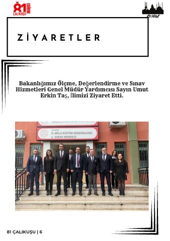 EDİRNE EDİRNE Z İ Y A R E T L E R Bakanlığımız Ölçme, Değerlendirme ve Sınav Hizmetleri Genel Müdür Yardımcısı Sayın Umut Erkin Taş, İlimizi Ziyaret Etti. 81 ÇALIKUŞU | 6