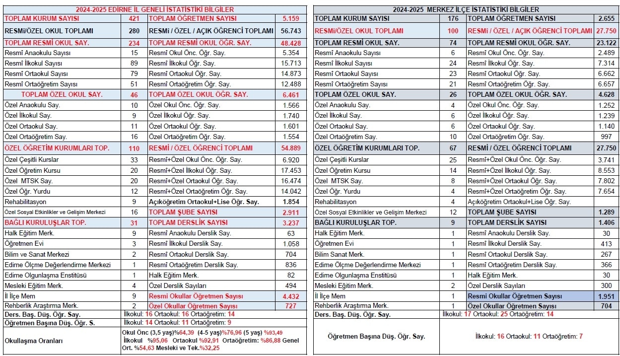 2024-2025 Edirne İl Milli Eğitim Müdürlüğü İstatistiki Bilgileri