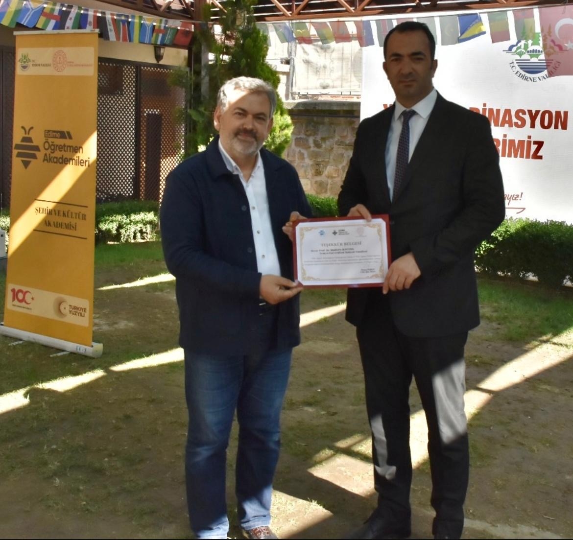 Akedemi buluşmasının ardından İl Millî Eğitim Müdürümüz Sayın Ferhat Yılmaz Öğretmenlerimize katkılarından dolayı Prof. Dr. Sayın Mustafa ŞENTÜRK'e katılım belgesi takdim etti.